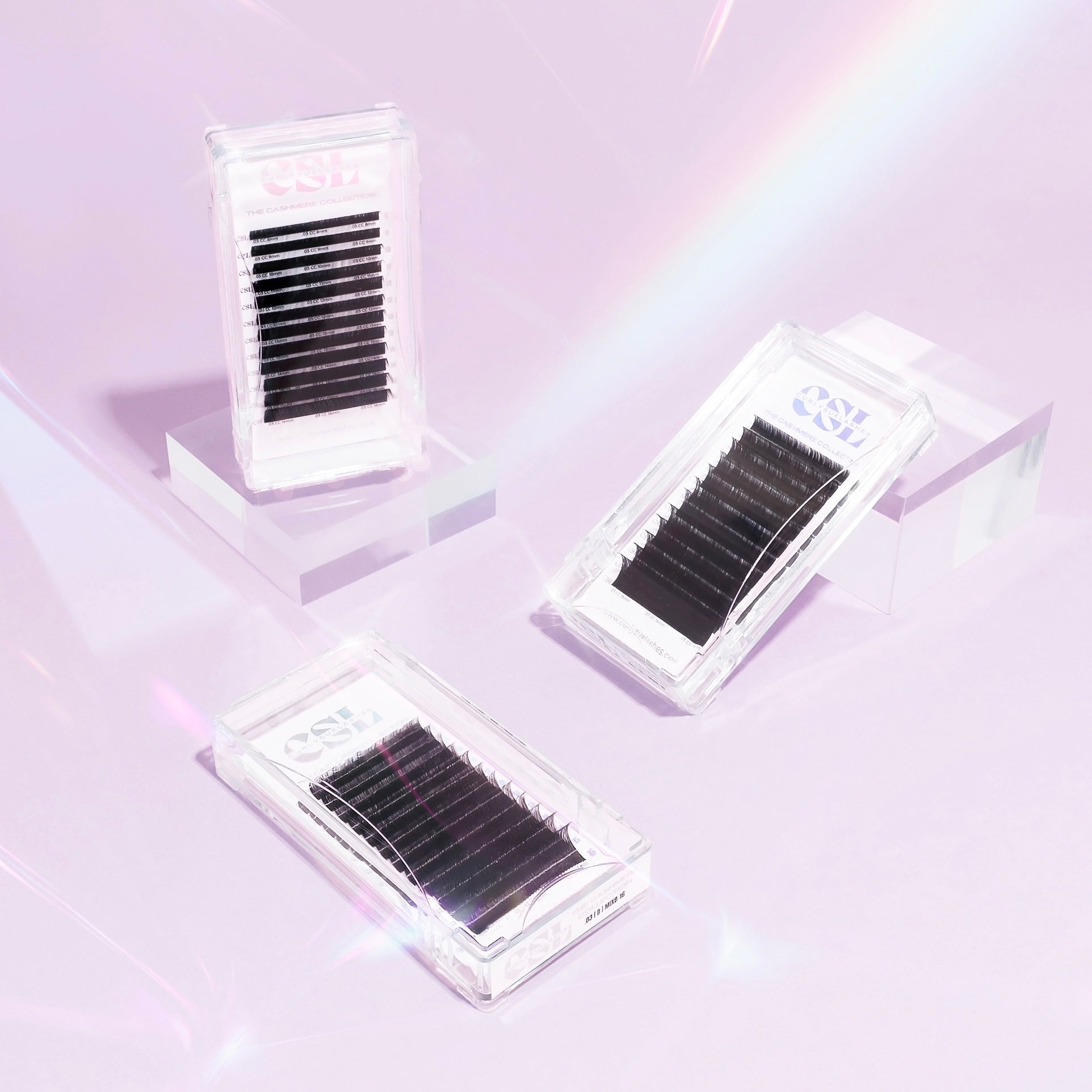 These volume lash extensions are our .03 collection which come in single length or mixed (8mm-16mm) trays or with 12 rows with foil backs. Our single length trays are available in CC or D curl lengths raging from 8mm-18mm.