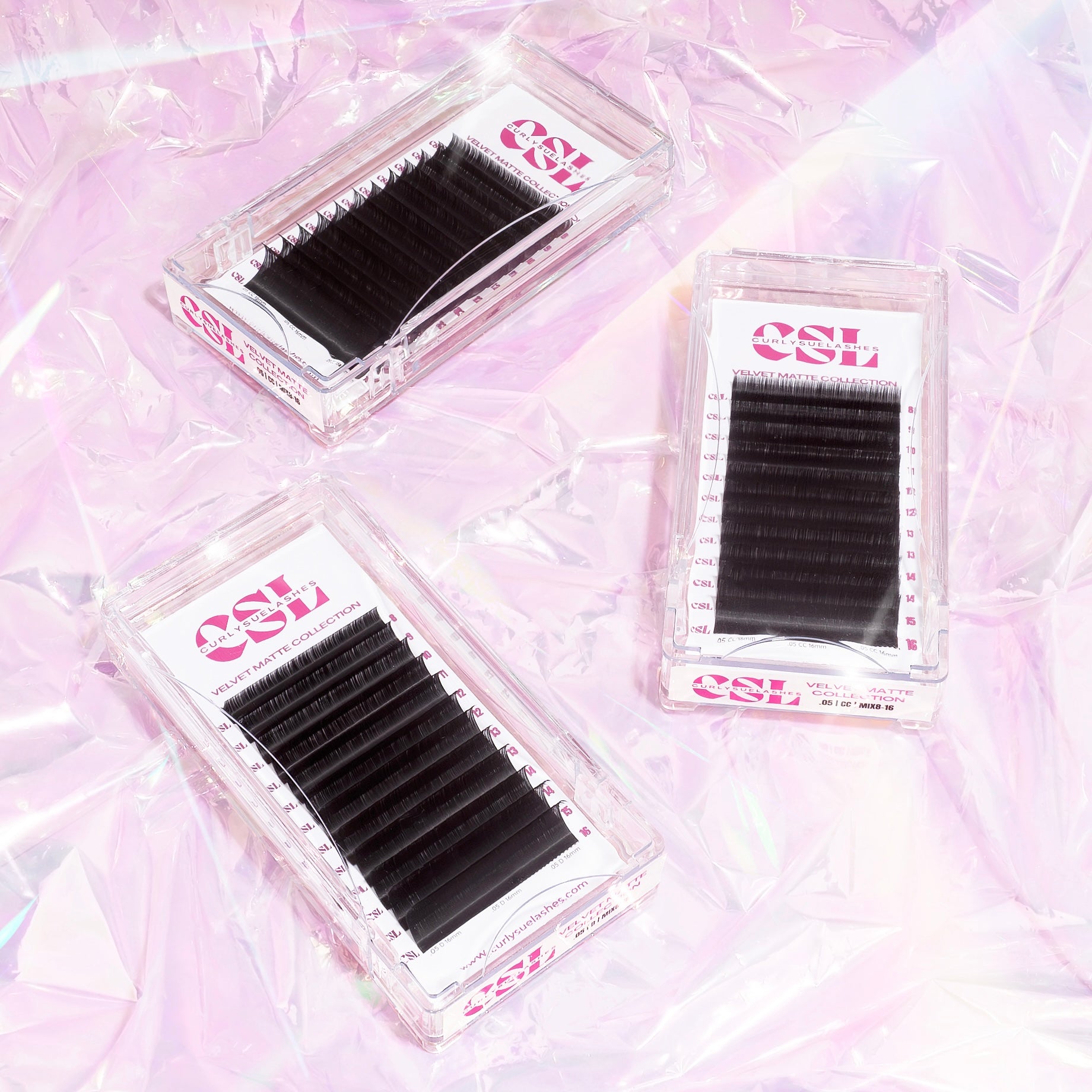 Matte finish fan like butter volume lashes available in CC + D curl in lengths 8mm-17mm with also both available in mixed trays. All foil backs + 12 rows in a stackable tray for your convenience.